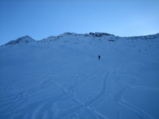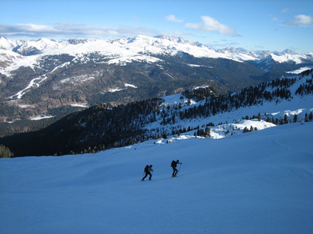 | salendo per gli ampi pendii sotto la cresta |